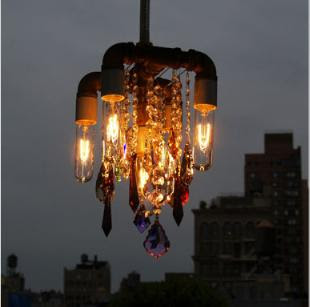 I love the way they combine the rough recycled piping with the fragility of mingled crystals and lightbulb glass -- very much a steampunk combination of the proper Victorian and the anarchist, combined to make a delightful lighting fixture for your dining room or above your billiards table.